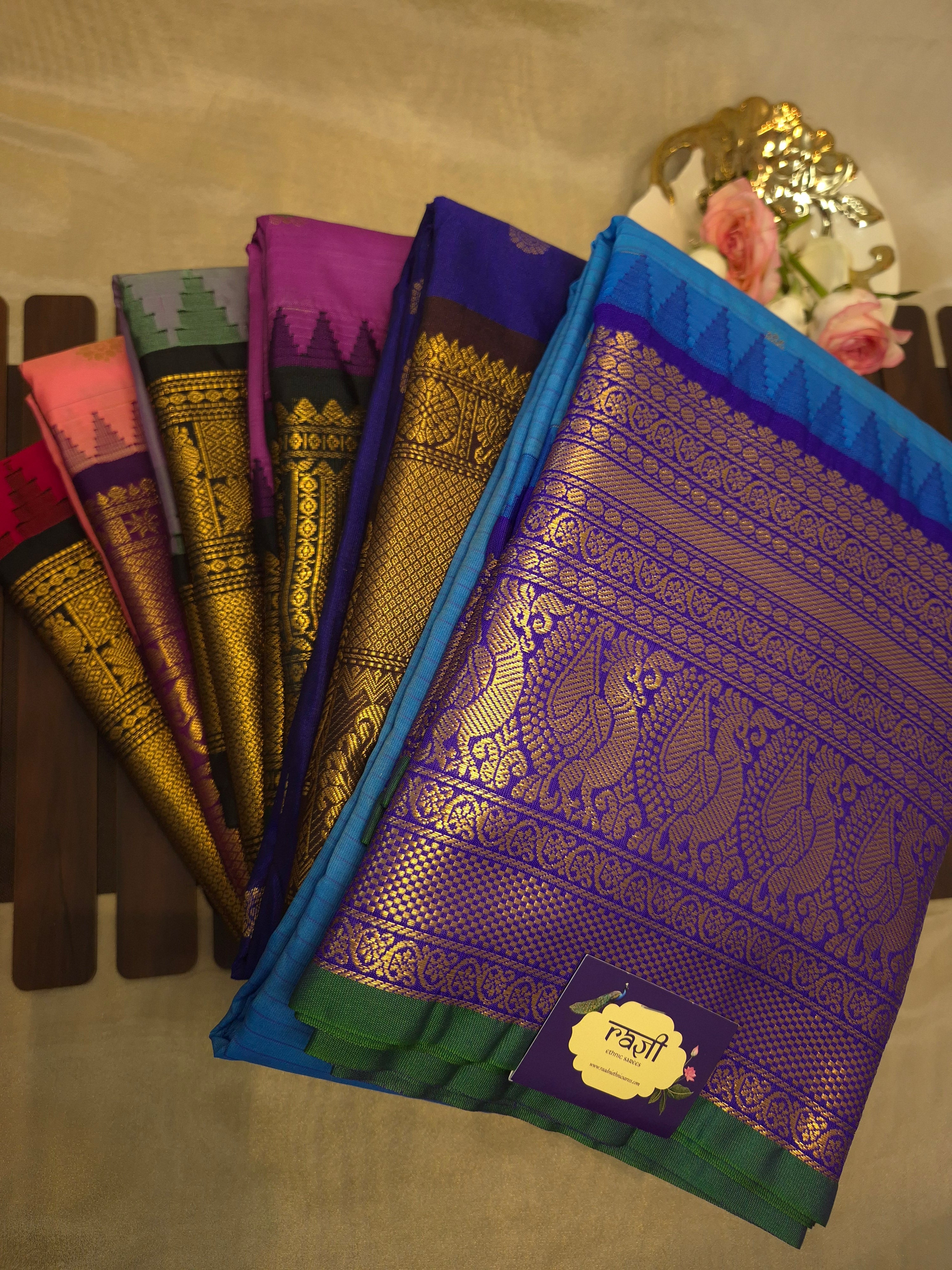 Purple Kanchipuram Silk Saree with Teal Border and Golden Zari