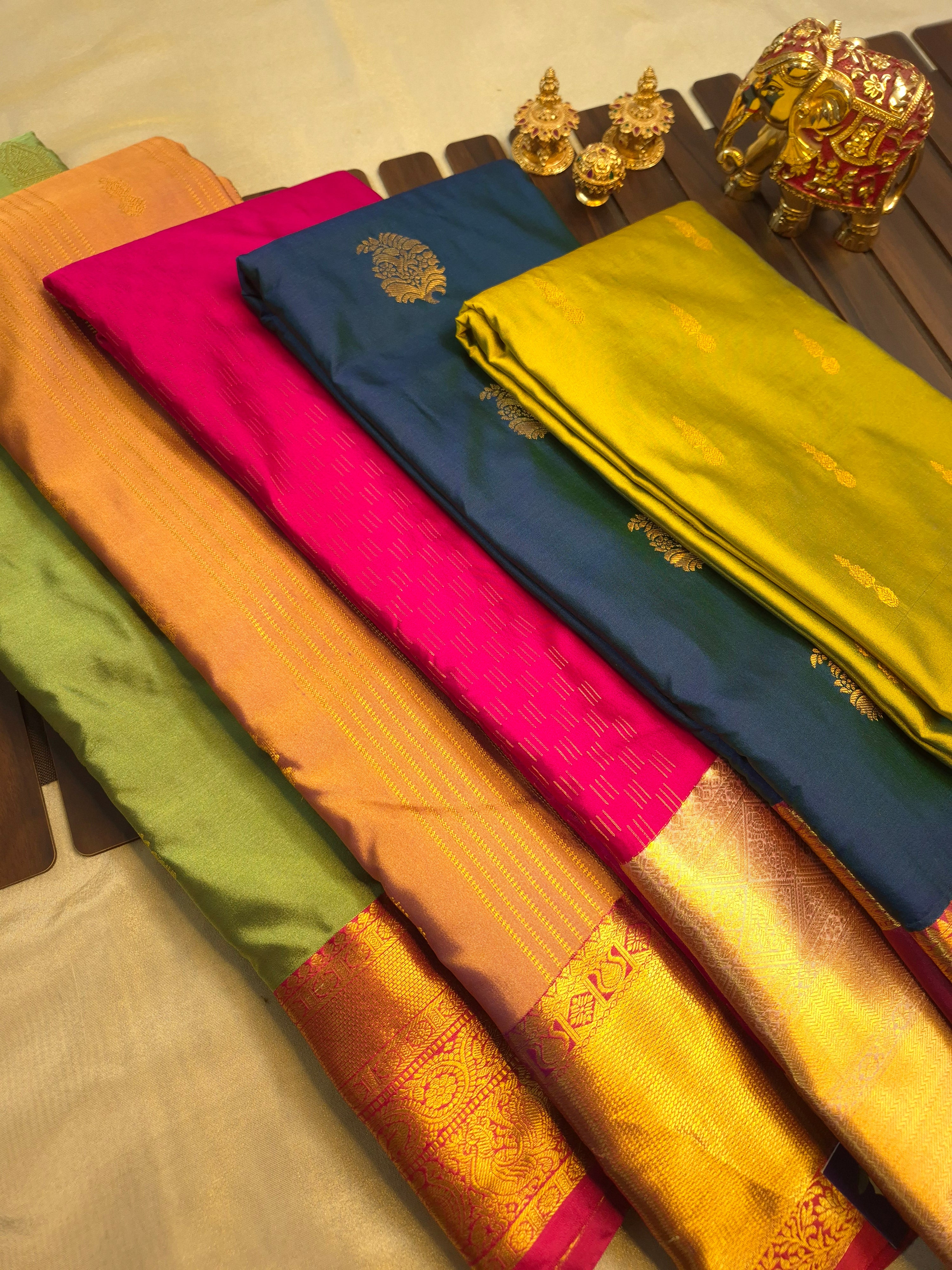 Amber Yellow Kanchipuram Pure Silk Saree with Golden Butta and Teal Green Copper Zari Border