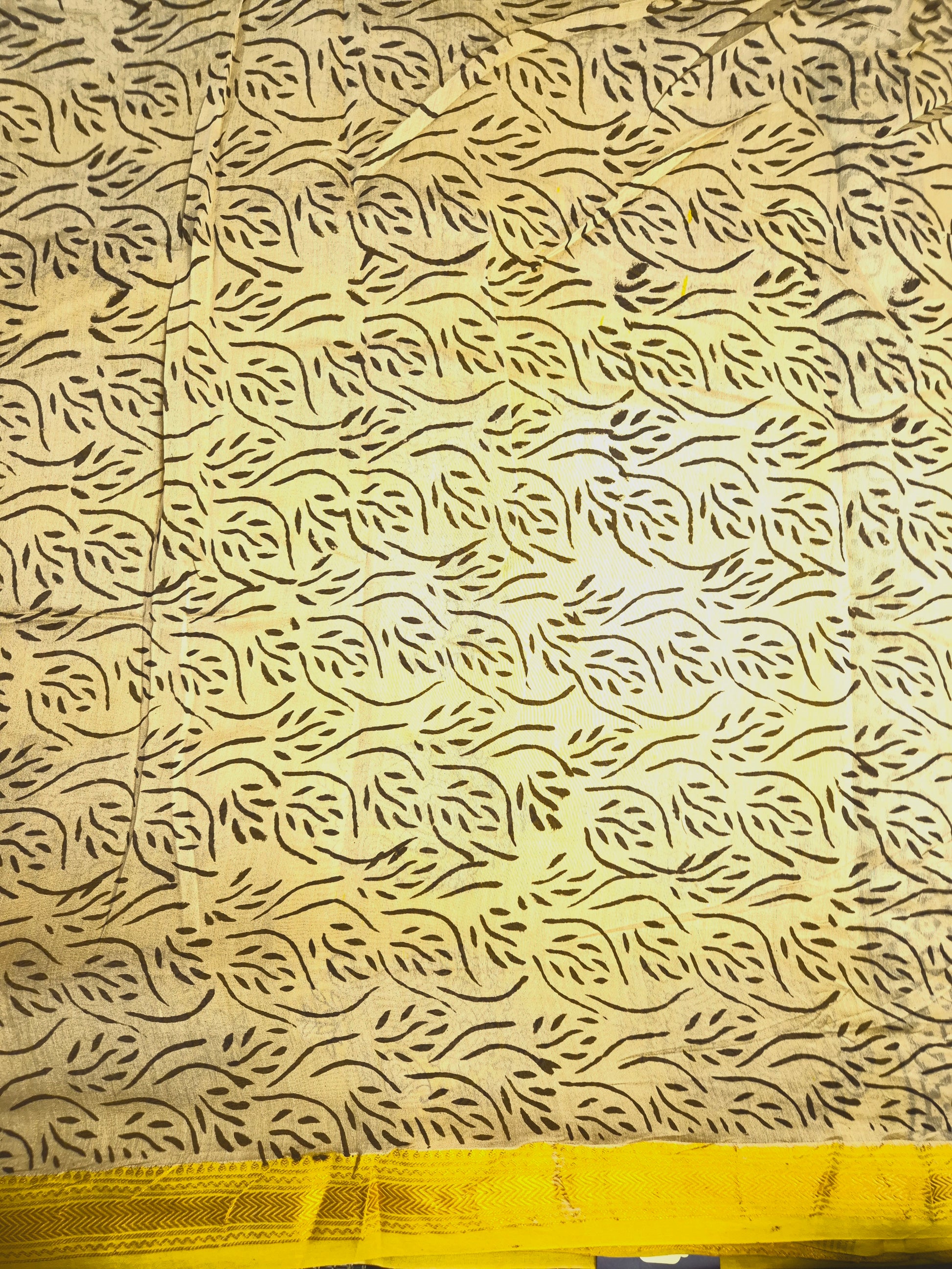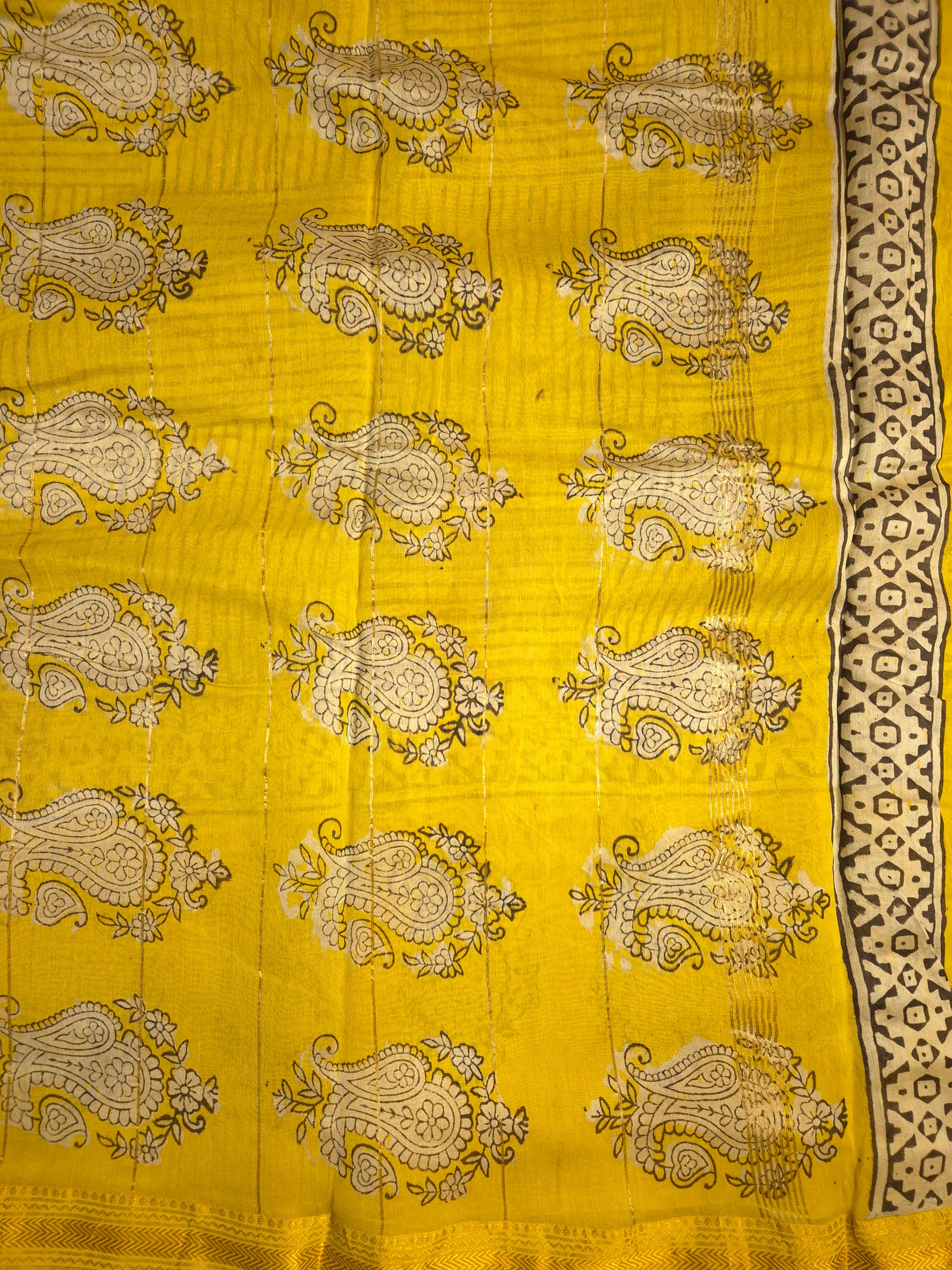 Ajrakh Printed Silk Saree with striped pattern and Broad Yellow Border
