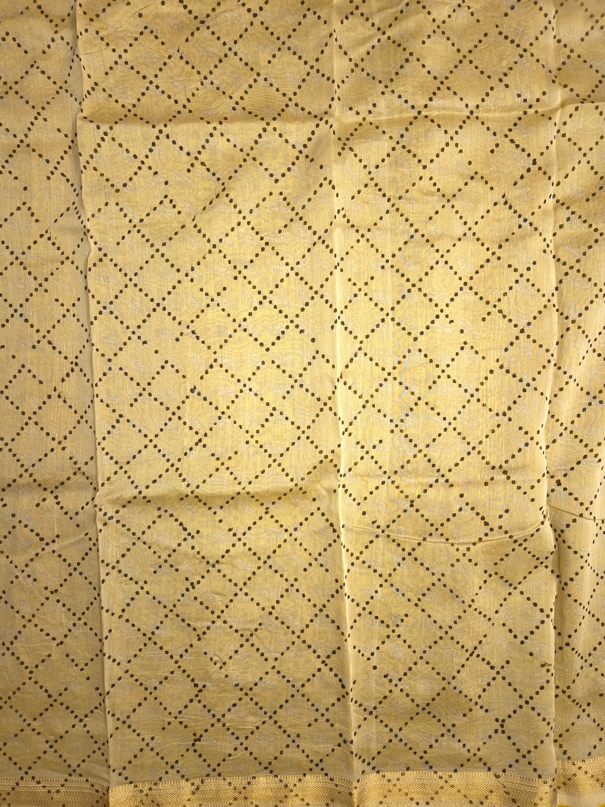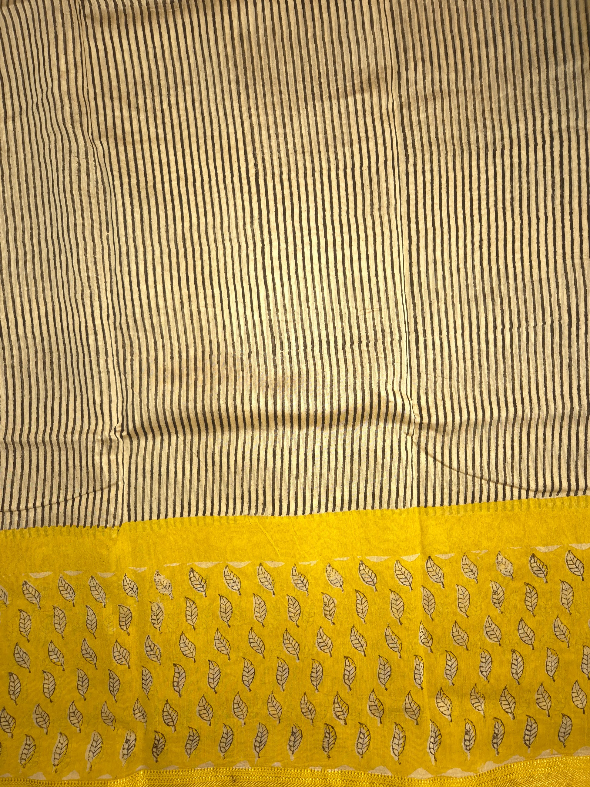 Ajrakh Printed Silk Saree with Striped Pattern and broad Yellow leaves print with Golden Zari Border