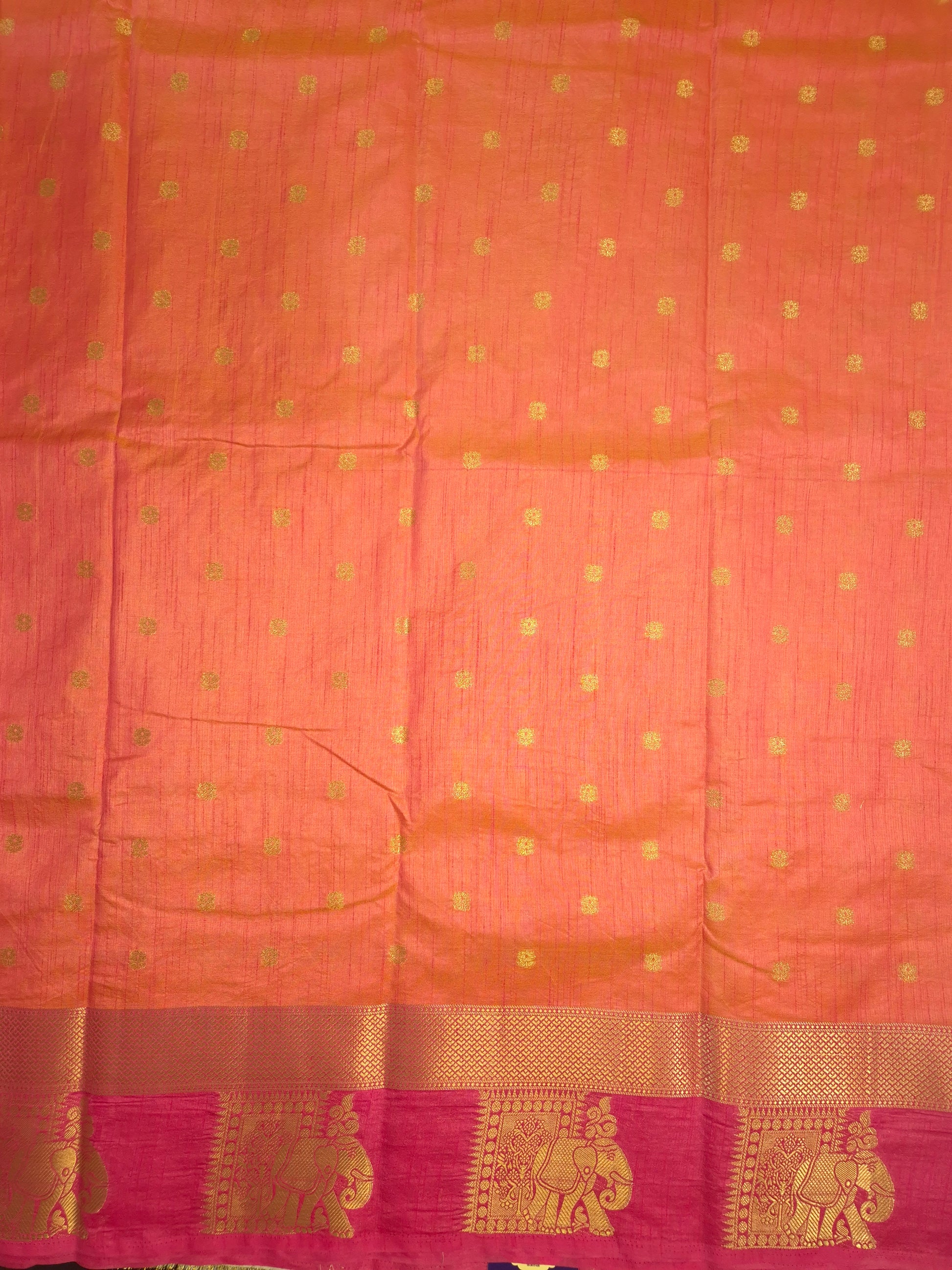 Dual Shade of Orange and Pink Raw Silk Saree with Pink Border and Elephant Motifs
