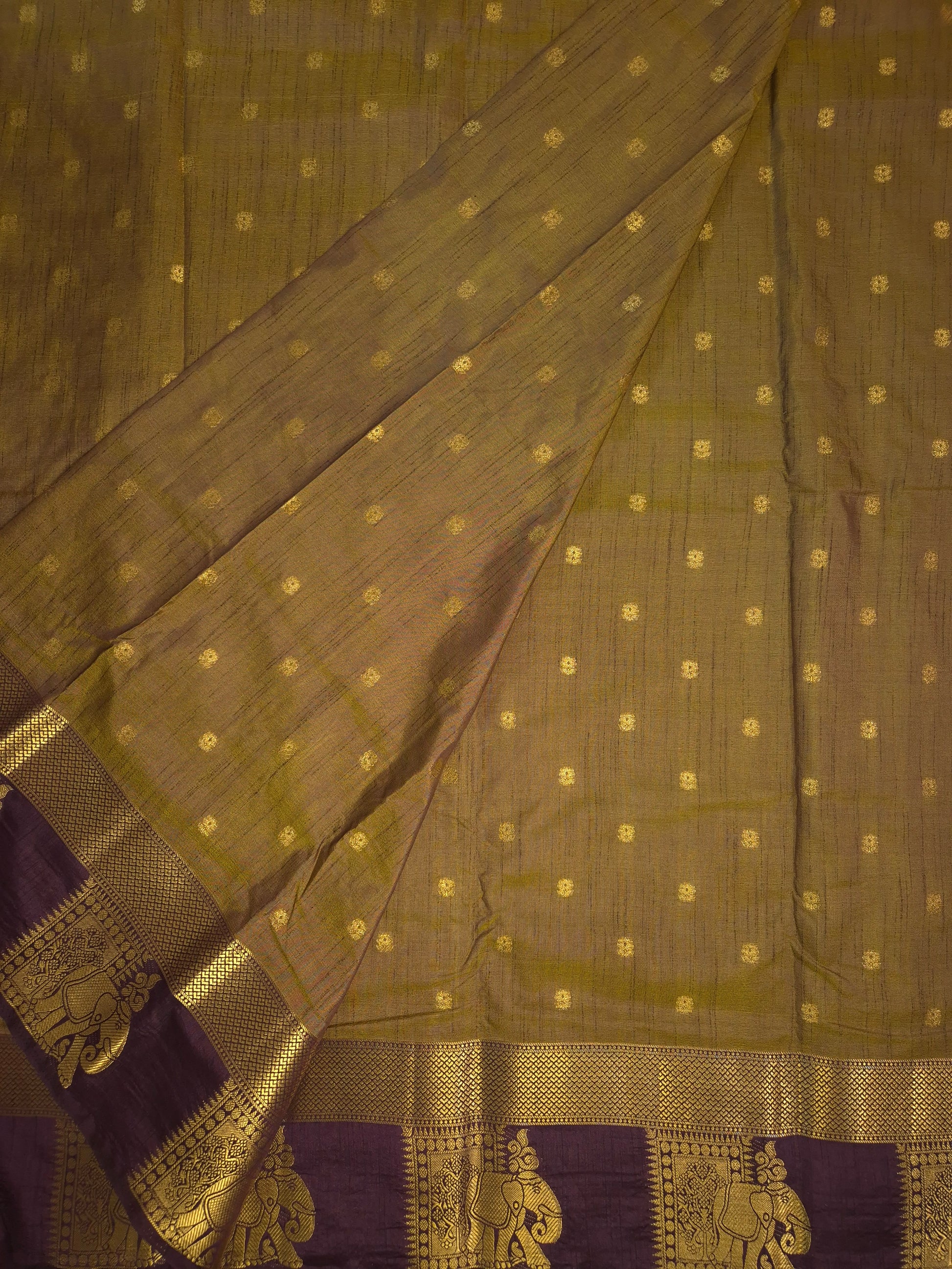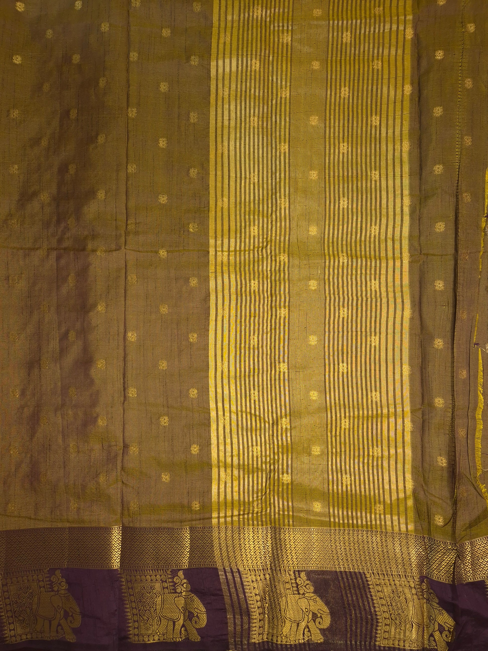 Dual Shade of Wine and Golden Raw Silk Saree with Wine Border and Elephant Motifs