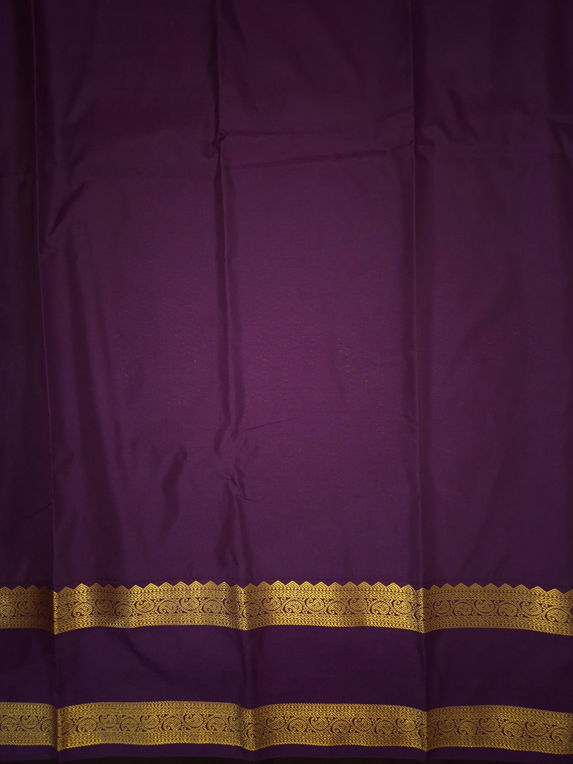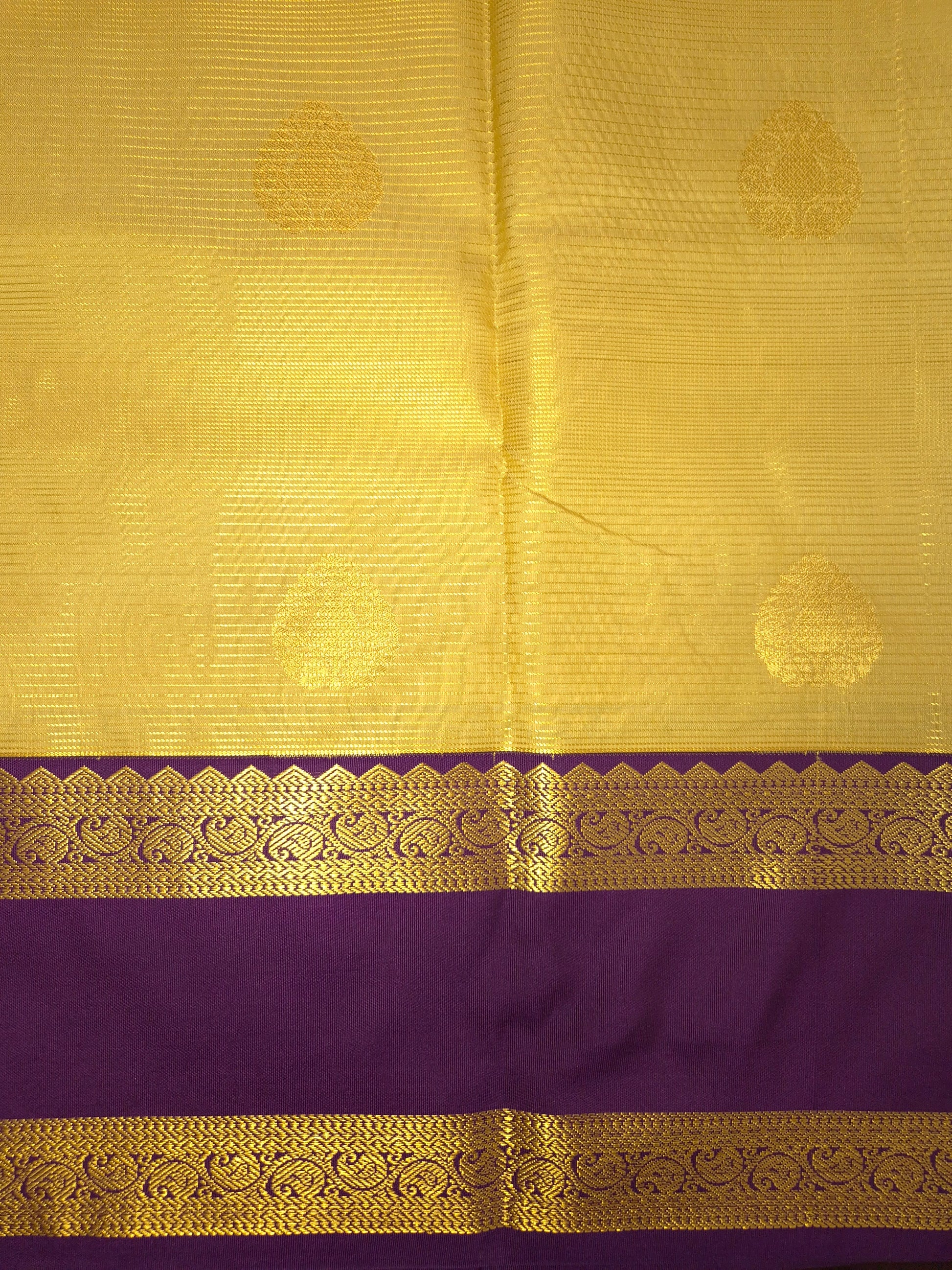 This elegant Golden Kanchipuram semi-silk saree features a timeless butta pattern throughout, adding texture and sophistication to the fabric. The contrasting dark purple border enhances its traditional charm, making it ideal for festive occasions and formal events. Crafted with meticulous attention to detail, this saree blends rich heritage with contemporary style for a refined look.