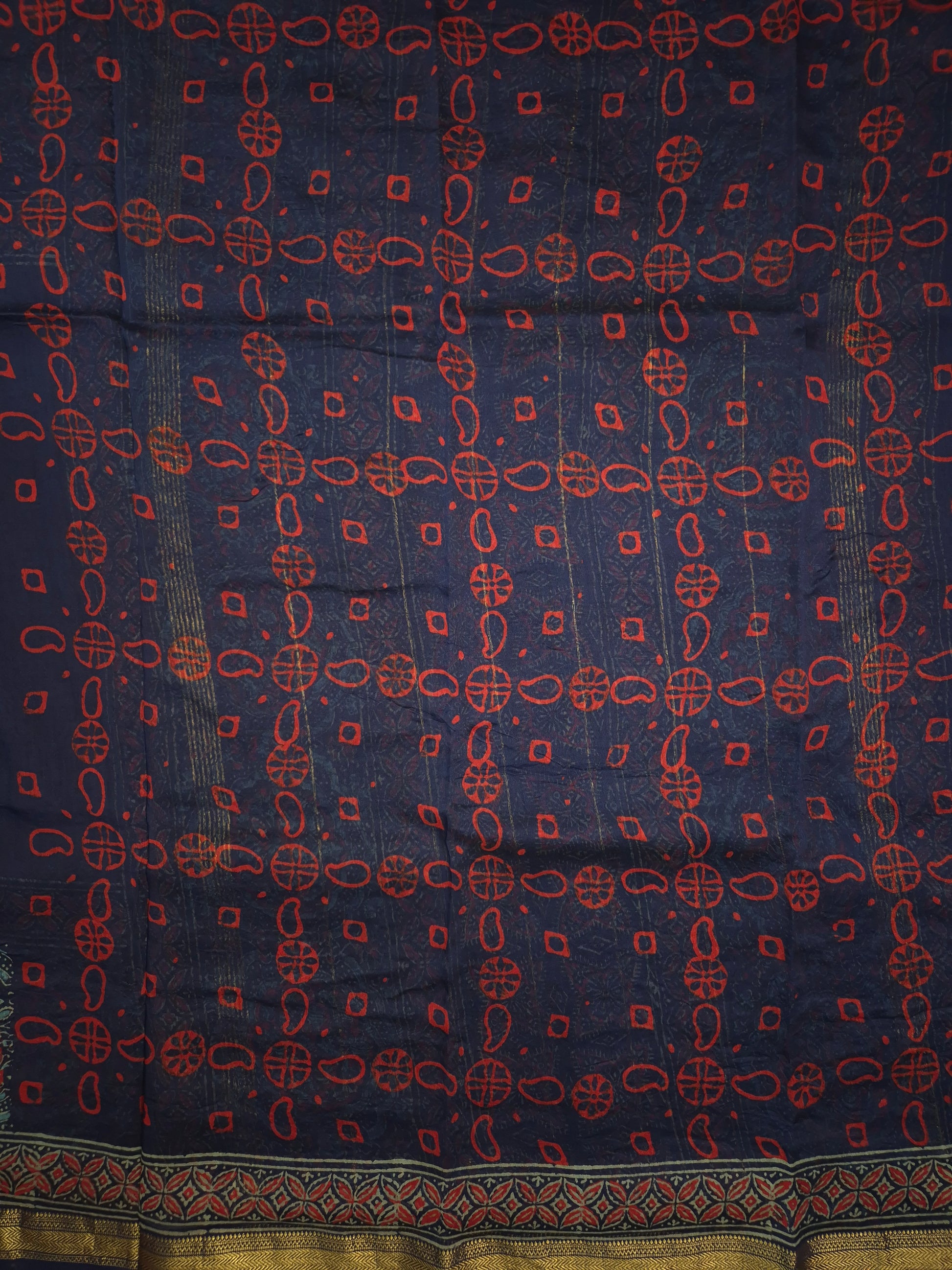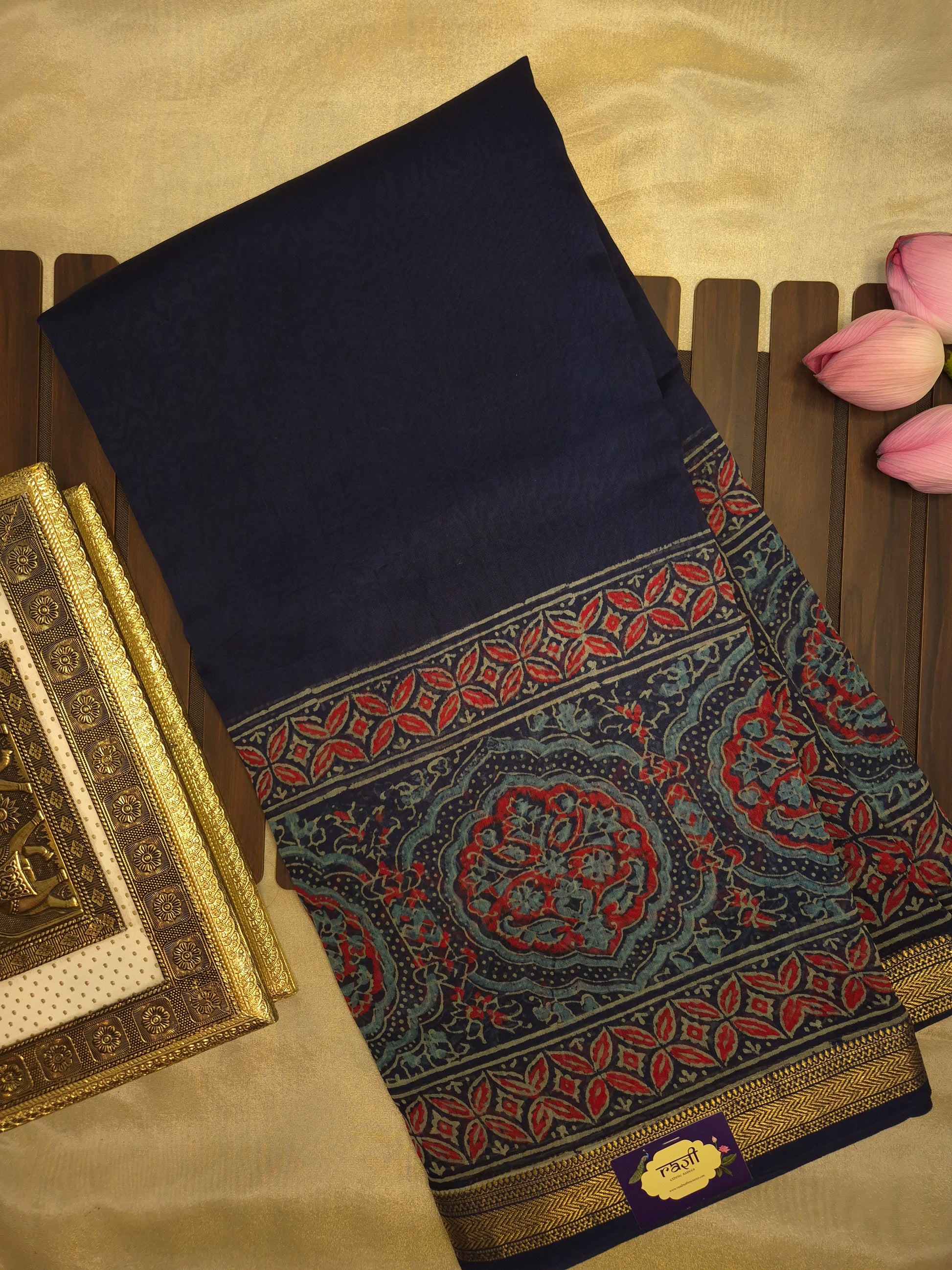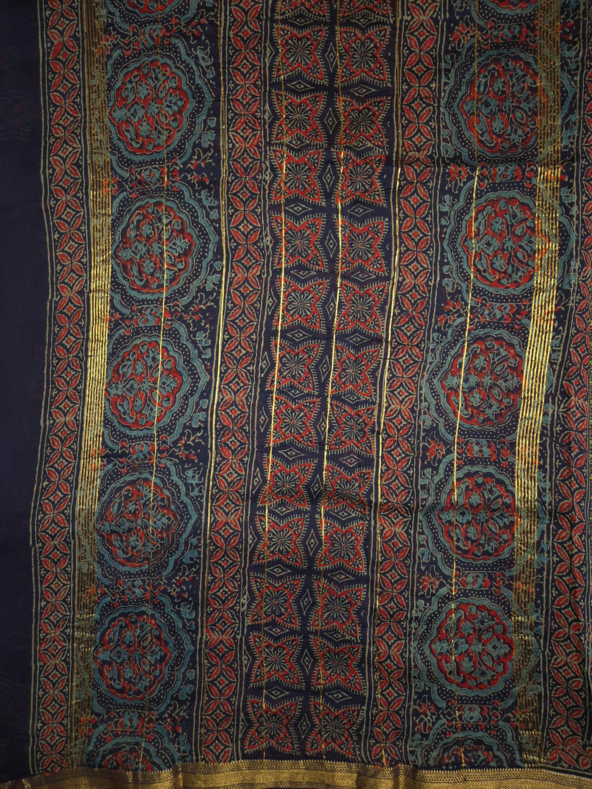 Navy Blue Ajrakh Printed Silk Saree with Intricate Floral Broad Border with Golden Zari