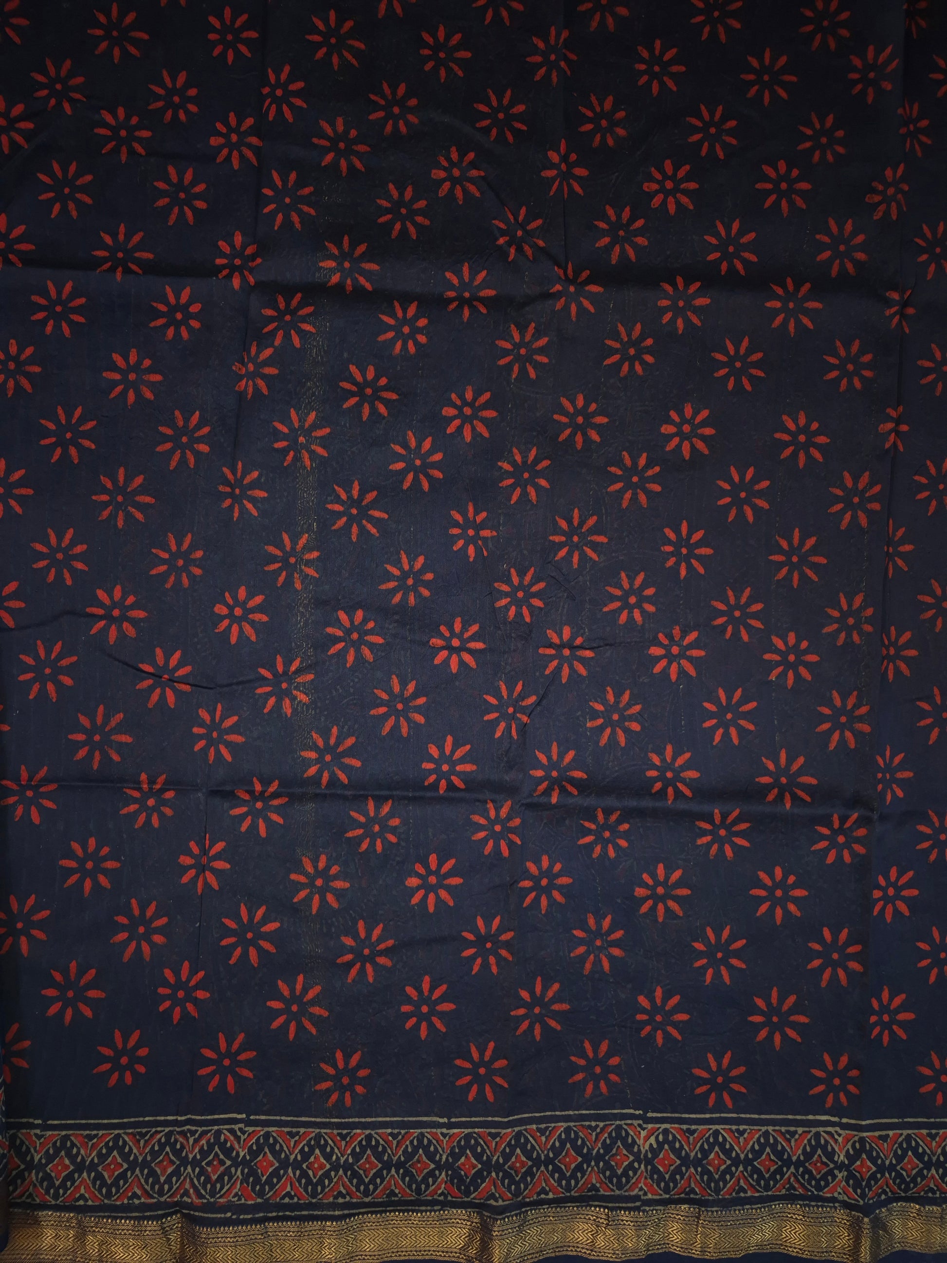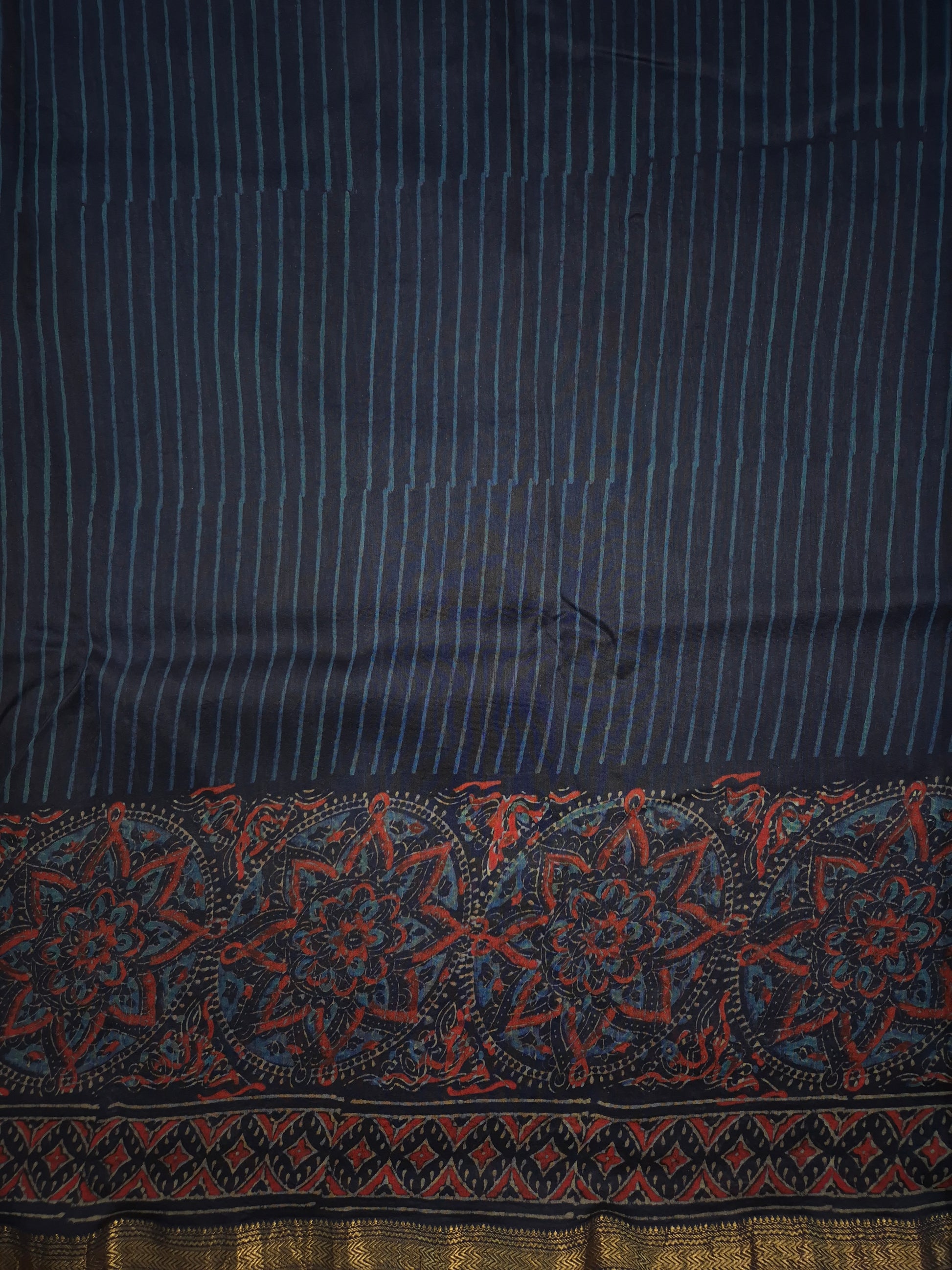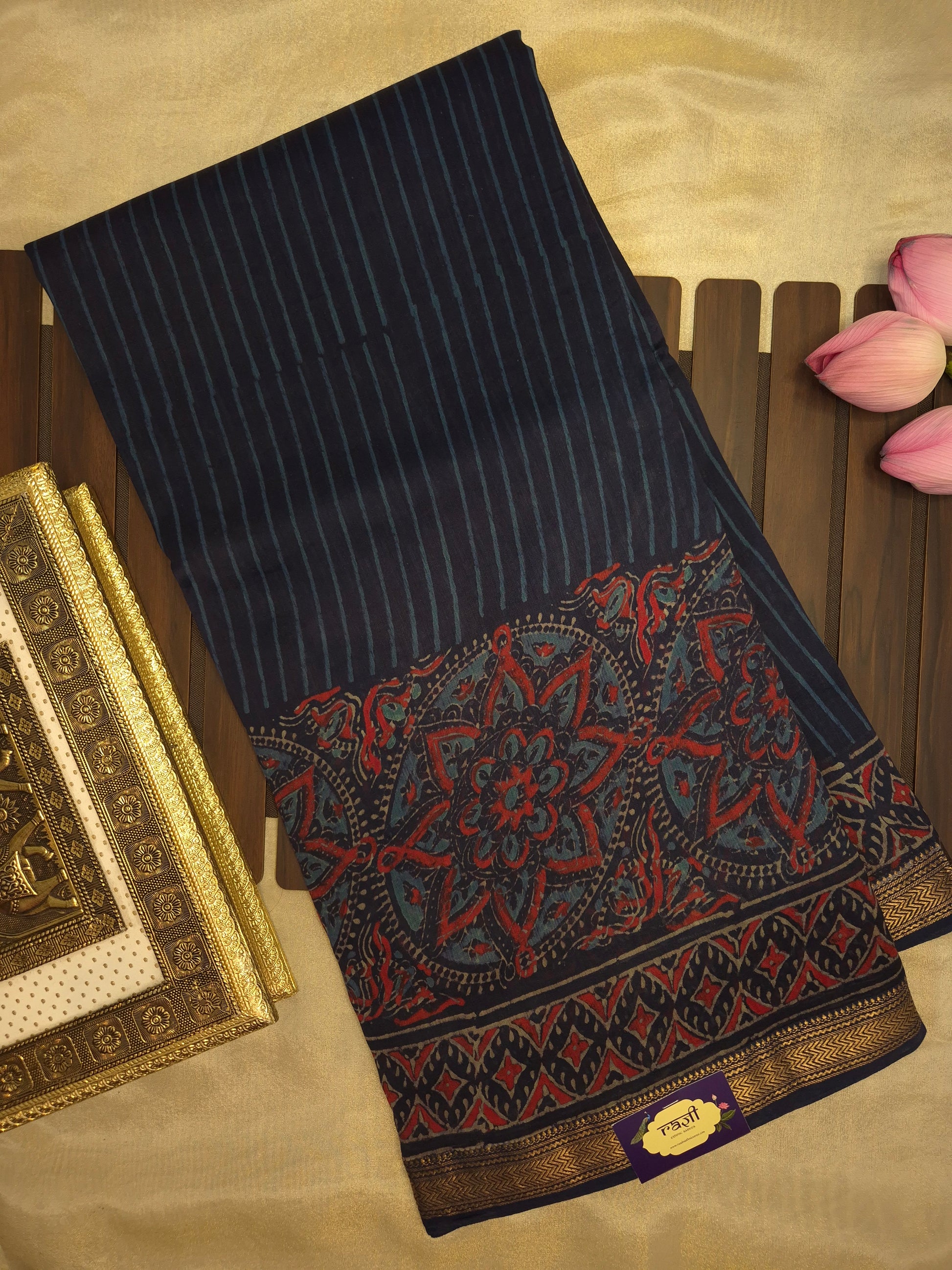 Navy Blue Striped Ajrakh Printed Silk Saree with Intricate Floral Broad Border and Golden Zari