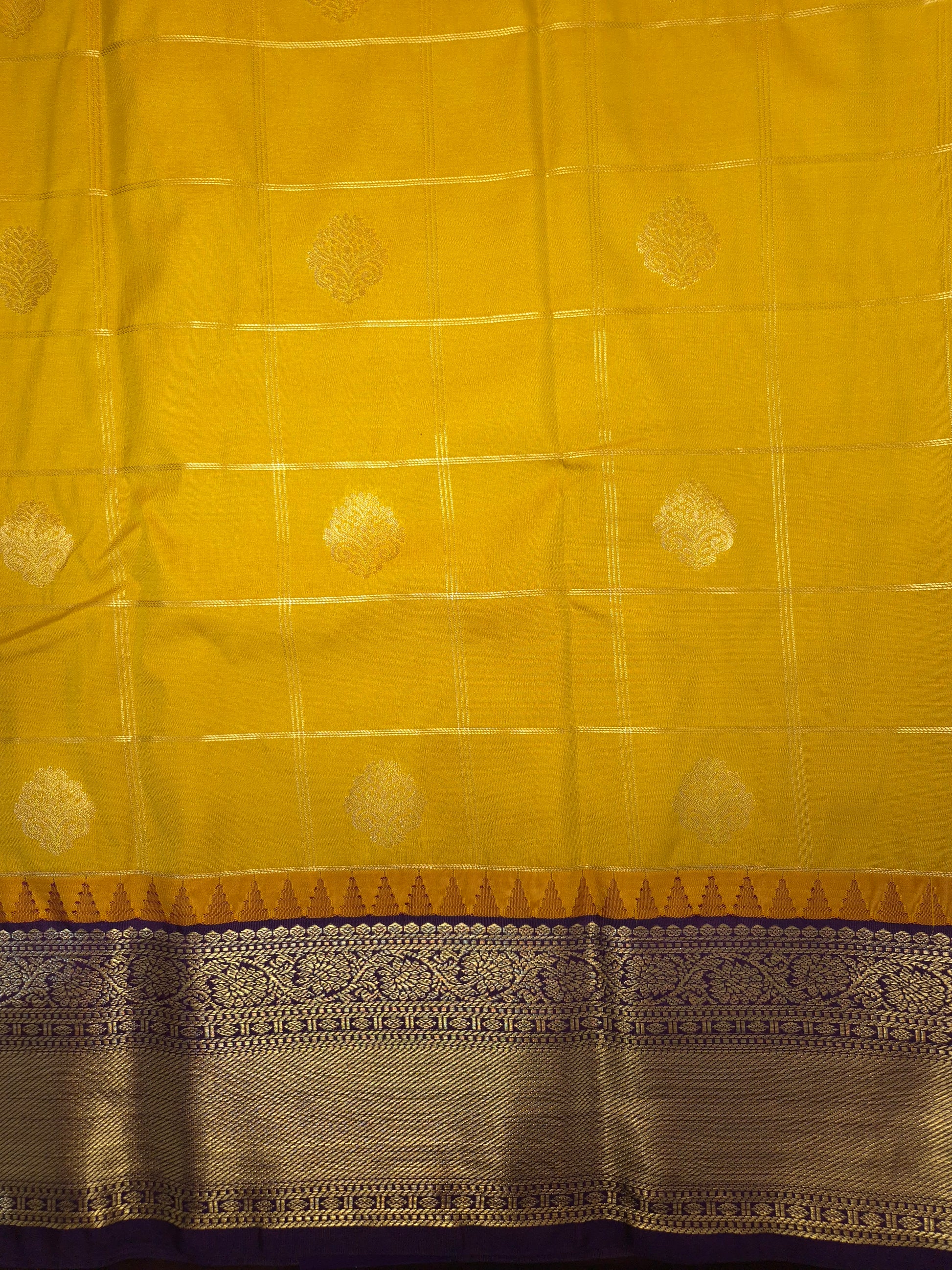 Yellow Checkered Kanchipuram Semi Silk Saree with Purple Border